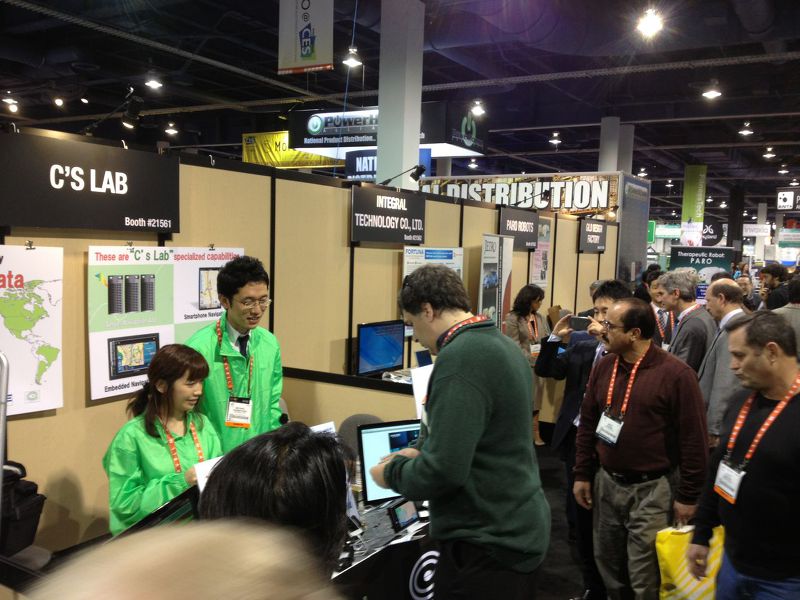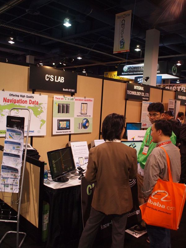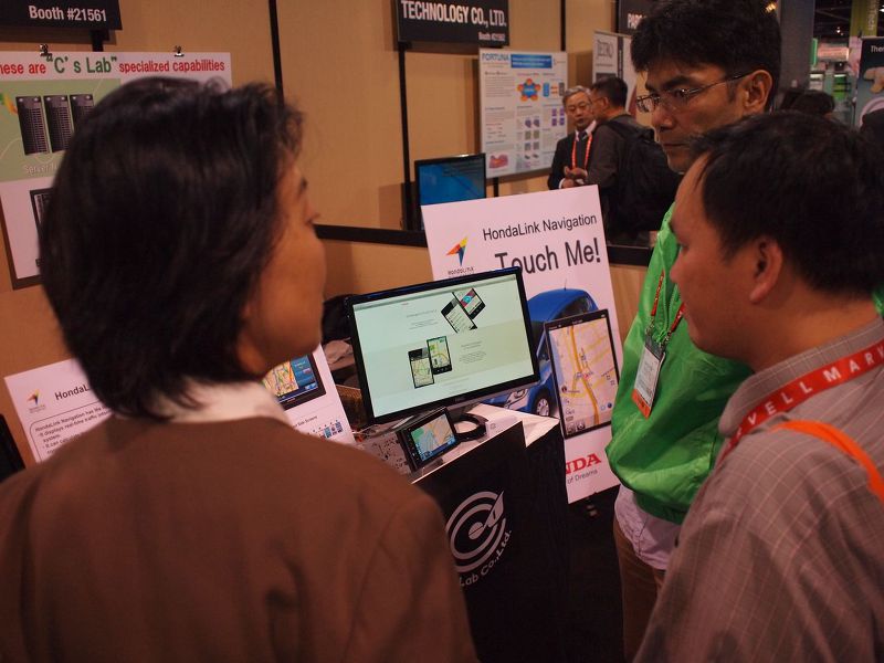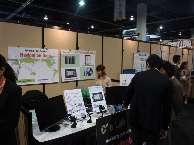 初日の現地レポートによると、来場者のみなさんはスマートフォンナビに興味があるようで、立ち止まって説明を読んだり、操作したり関心を集めていました。価格や入手方法などの質問が多く、すでにサービスされているGoogle Mapとの違いに関する質問が多かったようです。