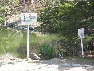 建物の周りは池がある庭園になっています。緑が深く、かつオフィス街に近いので、この庭園でランチをとる方もたくさんいらっしゃいます。鳥のさえずりも心地よく、市民の憩いの場所となっています。春先にはマガモの親子がいる年もあります。残念ながら今年は子鴨がいないようですが(もしかしたら、これから産卵かもしれません)、親マガモならこのとおり。![]()