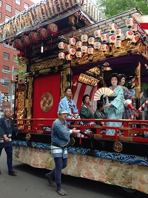 札幌市街地にある中島公園には夜店立ち並び大変にぎやかなのですが、開催期間中ずっと雨模様だったので少し残念でした。しかし!最終日、シーズ・ラボのすぐ近く大通公園を通る神輿や山車が練り歩く神輿渡御は辛うじて雨を免れました。![]()