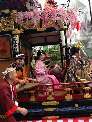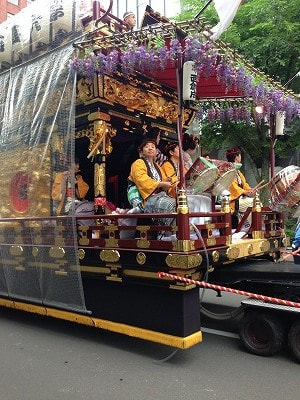 その昔、札幌市内を隅から隅まで神輿渡御していたそうですが、あまりにも日数がかかり過ぎ、1度だけトラクターを使って時速15キロで神輿渡御をしたことがあるそうです。あまりの早さに沿道の人たちは呆気にとられ、大変不評だったとのこと。翌年には元の神輿渡御に戻ったそうです。トラクターが山車を引いているのはその名残なのでしょうか?でも、現在は15キロよりかなりゆっくりな速度で走っていましたよ。