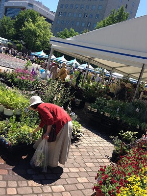 西6丁目から7丁目へかけては、花市場と題してガーデニング用品、花の苗などたくさん販売しています。その傍らには北海道名物とうきびワゴンも、いい香りでイベントを演出しています。![]()