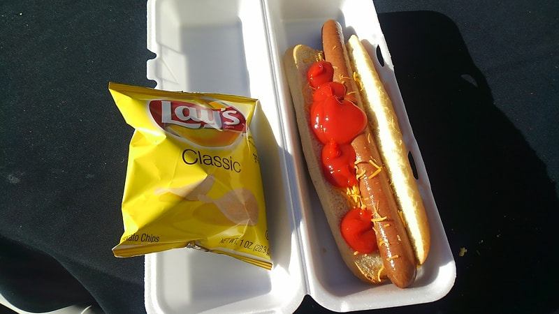 チーズ、ケチャップ、マスタードかけ放題。良心的なこの店はポテトチップが(野菜として!)付いてきます。