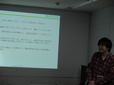 CES出展の報告と、シーズ・ラボが開発しているカーナビを持ってラスベガスからロスまでレンタカーで実走した報告の2部に分けて発表しました。