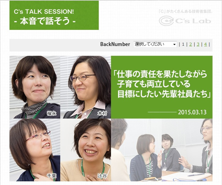シーズ・ラボの特徴のひとつでもある「ワーク・ライフ・バランスの導入」について、実際子育てしながら活躍している先輩社員が座談会形式でいろいろ語ってくれています。