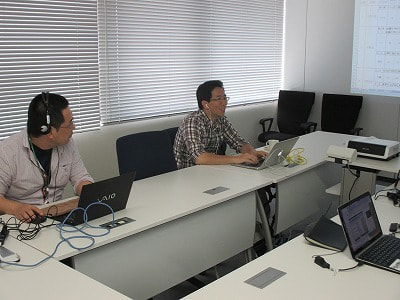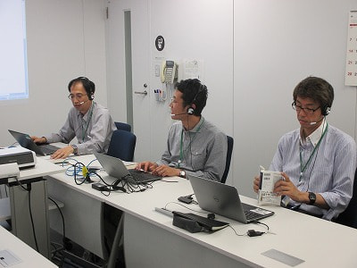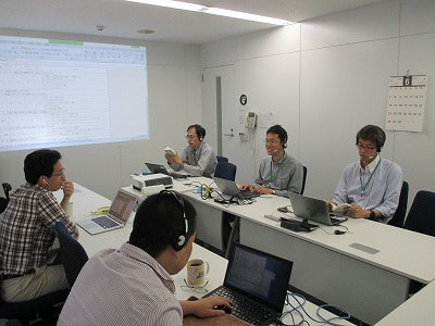 ヘッドセットしていますが、コールセンターではありません。東京オフィスのメンバーも参加するためWebを使ってミーティングするためなのです。