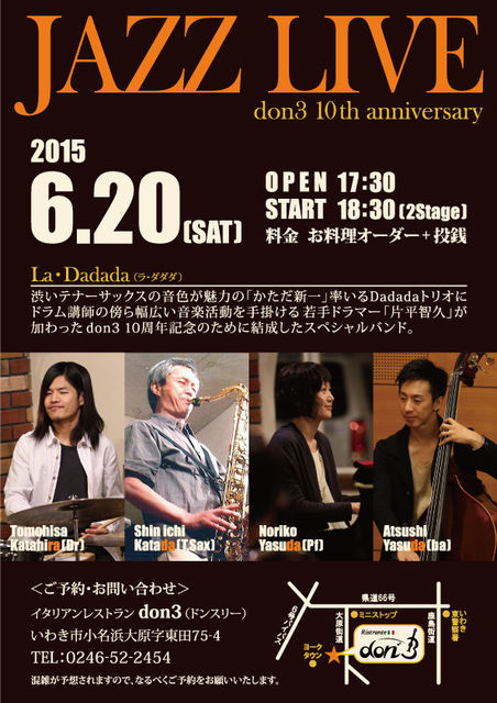 さて、ライブの詳細は「イタリアンレストラン don3」のHPをご覧ください。お問い合わせはお店の方にお願いしますね。