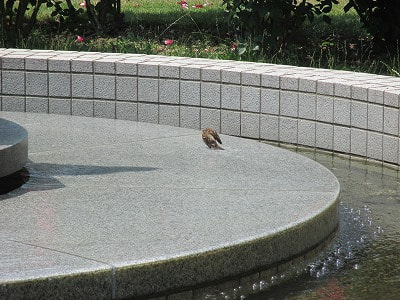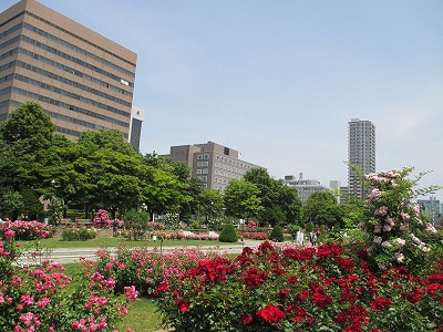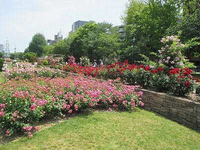 バラ園の中にいるといい香りがします。スズメが気持ちよさそうに水浴びしていて、まさに都会の中の癒しの空間です。![]()