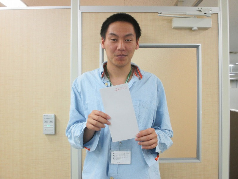 4月入社の篠原君が、情報処理試験ITパスポートを取得したので報奨金が出ました。おめでとうございます!