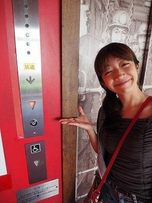 模擬坑道へいくエレベーターです。本当は1Fに行くのですが、本当に地下深く降りて行く演出がされています。