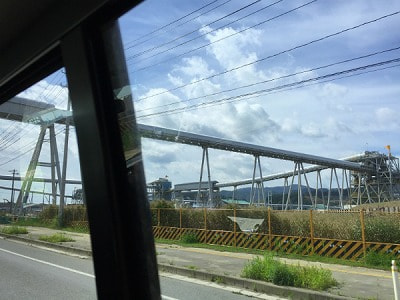 山を切り崩した土砂を、張り巡らされたベルトコンベアーで運び、津波対策のかさあげを行う工事が行われている。