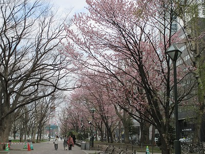 札幌の桜開花予報は4月26日でした。つまり本日ですね。例年より8日も早い開花とのことですが、本当に咲いているか大通公園に行ってチェックしてみましょう。今日は風が冷たく寒いのですが・・あ!ちゃんと咲いていますね~!結構、満開に近い勢いで咲いています。