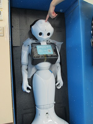 ジャーン!Pepper君です。あ、頭を突いていじめているわけではありませんよ(笑)Pepper君には、今日からシーズ・ラボの社員として一緒に働いてもらうことになりました!