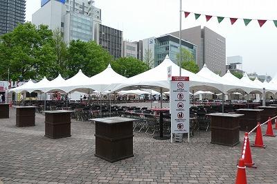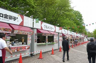 会場の大通公園には美味しいものを提供するブースがたくさん並んでいます。イートインスペースは屋根が完備なので雨でも安心ですね。