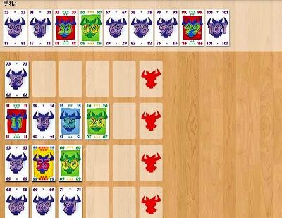 ザックリ簡単に説明すると、1~104の数字が書かれたカードを使い、自分の持ち点が引かれないように手札からカードを4列に並べていくカードゲームです。