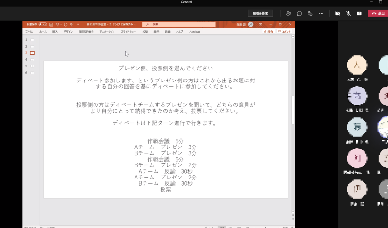 ディベートのテーマが「朝食はパン派?ごはん派?」ということで、各チームが審査員を納得させるプレゼンを行いました。