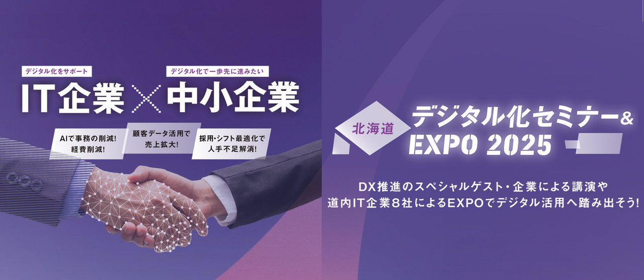 日々の業務においてデジタル化が進んでいない道内の中小企業・個人事業主を主な対象とし、デジタル技術の導入に関心を持ってもらうことを目的とした「北海道デジタル化セミナー&EXPO2025」が開催されます。