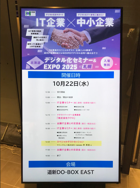 2025年10月22日(水)、札幌市中央区のDO-BOX EASTにて開催された「北海道デジタル化セミナー&EXPO 2025」に、私たちシーズ・ラボは出展企業として参加いたしました。