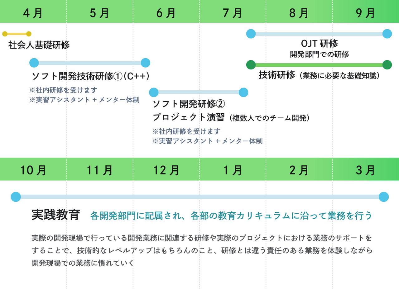 | 新人教育期間 | 1ヶ月〜6ヶ月程度 | 座学(3ヶ月) + プロジェクト演習(1ヶ月) + OJT(2ヶ月)+実践教育(6ヶ月) |